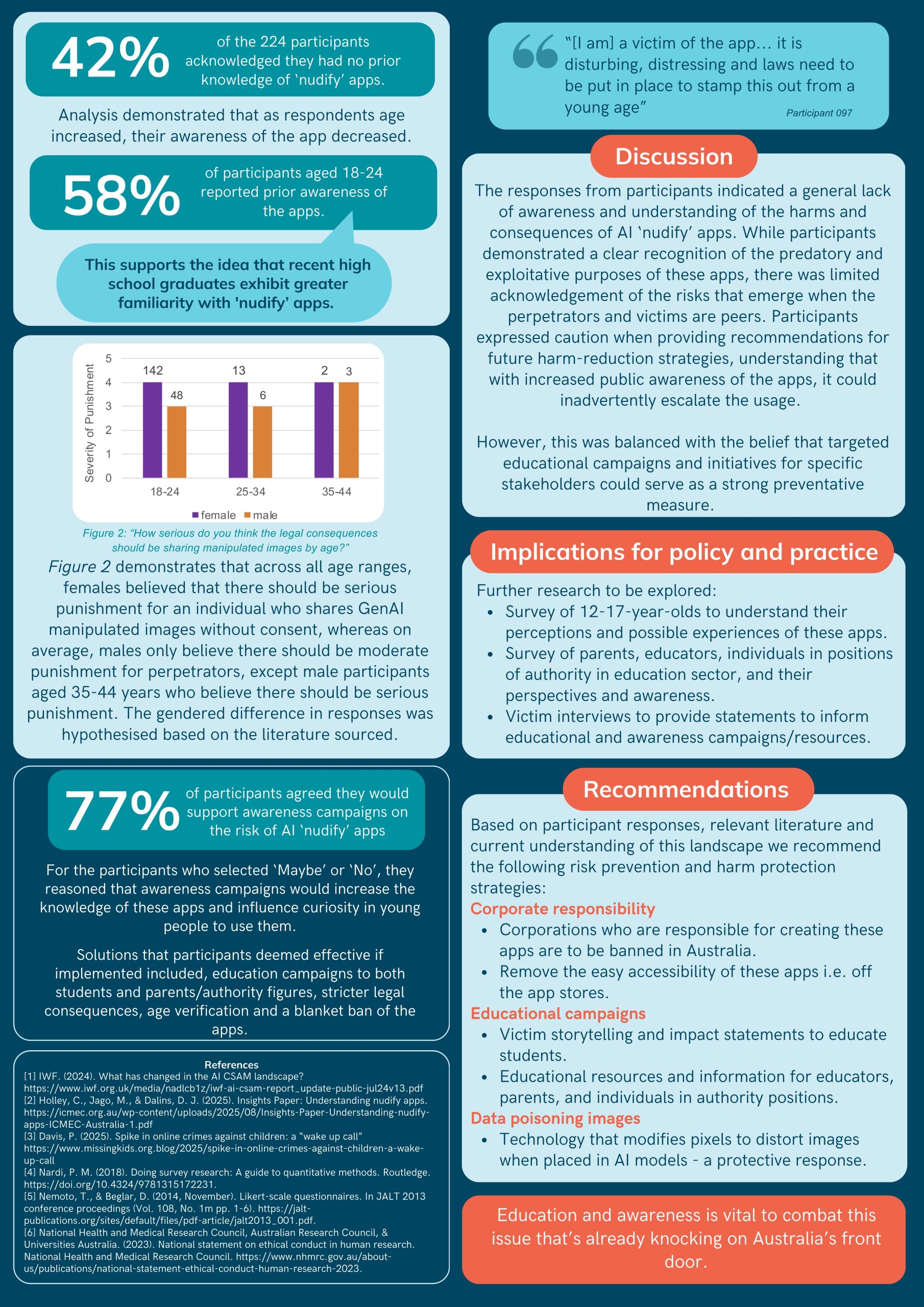 Drawing on a survey of more than 250 university students, the research found that 42 per cent of respondents had never heard of nudify apps, with many identifying the normalisation of digital sexual violence and privacy invasions as the most significant long-term risks. The majority strongly agreed that nudify apps should be banned across all app stores. The research students recommended greater education and awareness campaigns, stronger corporate responsibility, and technical measures such as data poisoning, as well as further research including engagement with 12- to 17-year-olds to better understand awareness and experiences.